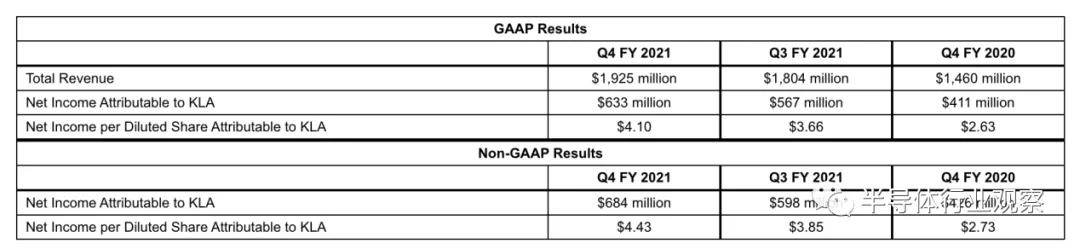 截至 2021年3月31日(FY2021 Q3),KLA-Tencor总收入为 18 亿美元(去年同期是14.2亿美元),归属于 KLA 的非 GAAP 摊薄每股收益为 3.85美元。截止2021年6月的季度业绩(FY2021 Q4),总收入为19.3亿美元(2020财年同期是14.6亿美元),归属于 KLA 的非 GAAP 摊薄每股收益为 4.43 美元。所以整体来看,2021年上半年KLA的总营收为37.3亿美元,相比2020年上半年的28.8亿美元,同比增长29.5%。KLA-Tencor 2021年上半年的财报一览(图源:KLA-Tencor)KLA指出,EUV光刻系统今年将增长30%左右。光学图案晶圆检测预计将成为2021年WFE产品增长最快的部门之一。这些细分市场的收入超过10亿美元。此外,KLA 的旗舰标线检测业务在 2021 年有望创下历史新高。KLA还估计当今几乎所有 5 纳米的光罩都由KLA系统检查。其基于下一代电子束的 8XX 掩模检测平台已于上个季度发货,并已开始为3纳米及以下应用提供客户资格认证。<br style="margin: 0px; padding: 0px; outline: 0px; max-width: 100%; box-sizing: border-box !important; word-wrap: break